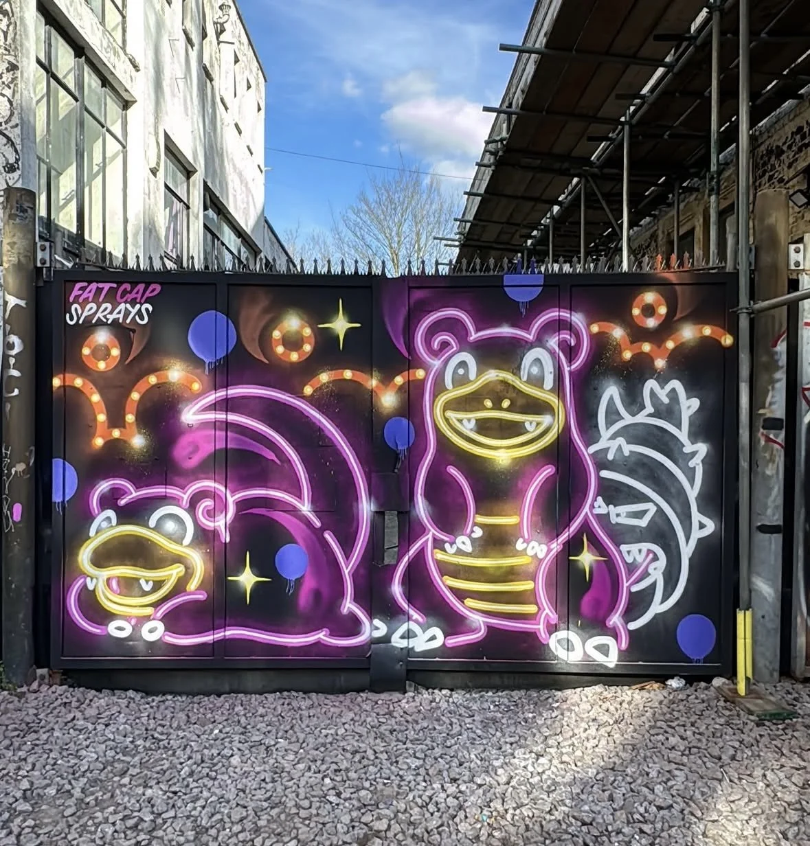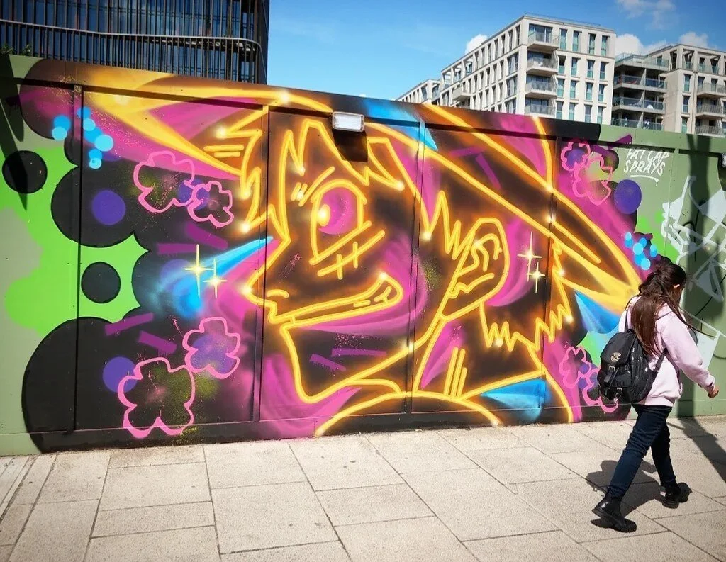 Fat Cap Sprays is a London-based artist renowned for merging street art with pop culture in a vibrant neon twist. His distinctive style recontextualises prevalent characters and objects in pop culture by utilising vivid strokes with bold colours that illuminate the artworks. Drawing inspiration from video games, films, and cartoon series, the artist evokes a sense of nostalgia and fantasy in the viewer.